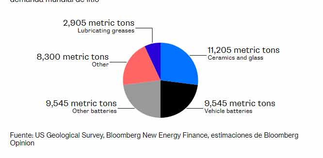 Los vehículos eléctricos están a punto de transformar el mercado del litio, pero todavía no están allí. Los usos sin batería, como la cerámica y el vidrio, los lubricantes y los polímeros, representan más de la mitad de la demanda, según el Servicio Geológico de los EE. UU. Incluso dentro del sector de la batería, los vehículos eléctricos solo superarán a la electrónica de consumo como el mayor usuario de este año .