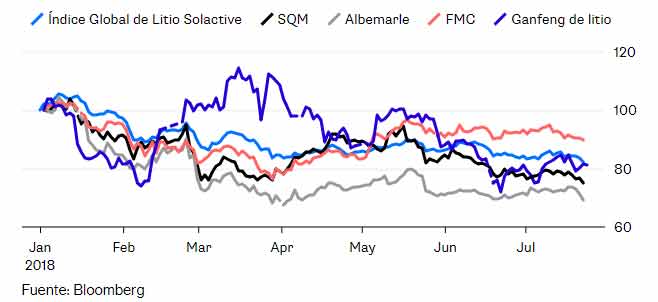 El Índice Global de Litio Solactive, en el cual FMC Corp., Albemarle Corp. y SQM tienen una ponderación de alrededor del 40 %, cayó hasta un 2,1 % el lunes a su nivel más bajo en 11 meses. SQM cayó hasta un 4,8 %, mientras que Albermarle cayó un 4,1 por ciento.