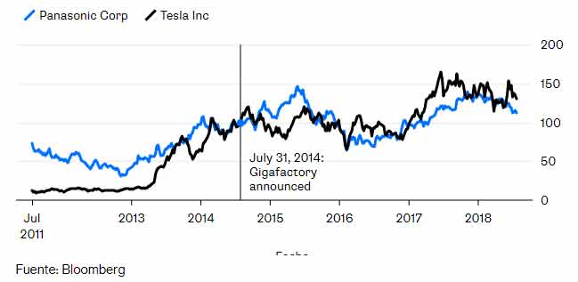 El precio de las acciones de Panasonic sigue altamente correlacionado con las esperanzas de Tesla. El aumento en la producción del Modelo 3 impulsará el crecimiento futuro de las ganancias operativas, pero, según las cifras, la compañía estadounidense ha contribuido solo con alrededor del 2 por ciento de los ingresos del fabricante japonés de productos electrónicos, según datos compilados por Bloomberg.