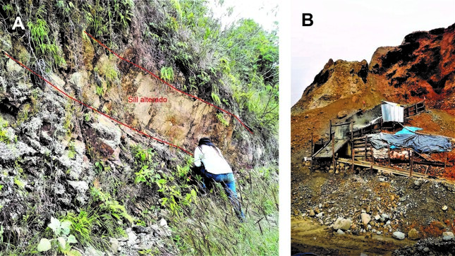 La Formación Sandia contiene franjas auríferas de vetas y mantos con oro libre, los cuales presentan valores entre 5.69 a 16.33 g/TM