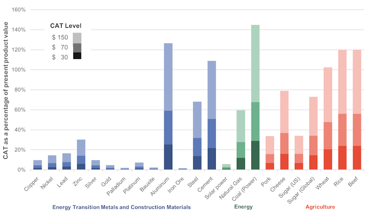En algunos casos, el impuesto al carbono puede ser mayor que el valor del producto. Cuando el precio del carbono es de US$ 150, el carbón se grava al 144 por ciento de su valor. El cobre, por otro lado, se grava al 10 por ciento de su valor.