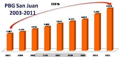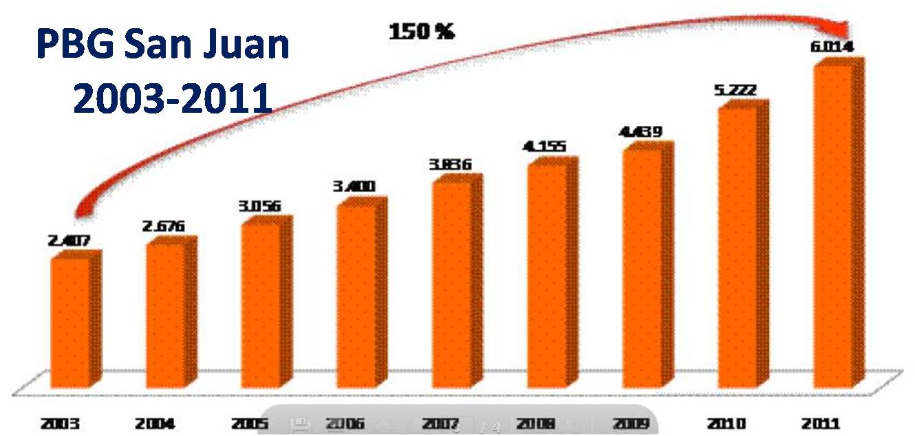 estimaciones para el 2011, el PBG de San Juan creció un 15%, mientras que las exportaciones aumentaron un 19%, y la tasa de desocupación bajo un 25%, respecto al 2010.