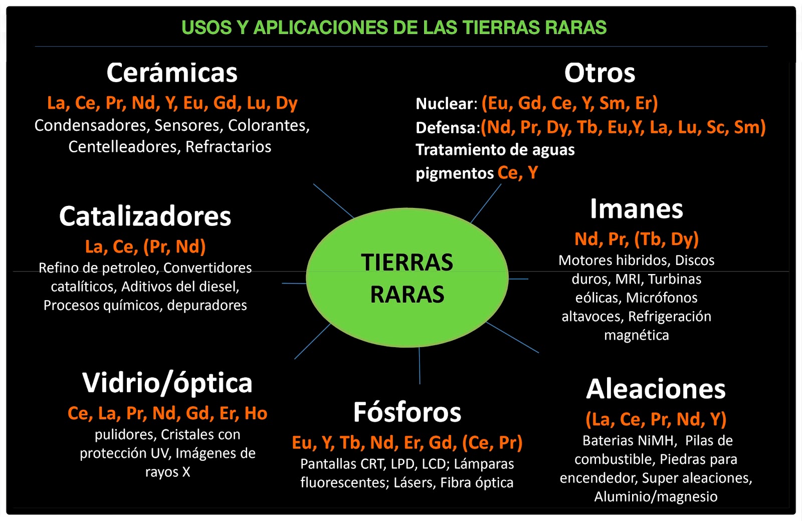 Las aplicaciones de las tierras raras son muy amplias y aumentan constantemente. Hoy en día se usan ya para producir discos duros de ordenador, equipos de sonido, catalizadores de automóviles, pilas de combustible, imanes permanentes, teléfonos móviles inteligentes, pantallas de T.V., pantallas táctiles, turbinas eólicas, paneles solares o lámparas de bajo consumo, materiales para cerámicos, materiales ópticos, entre otros muchos objetos.