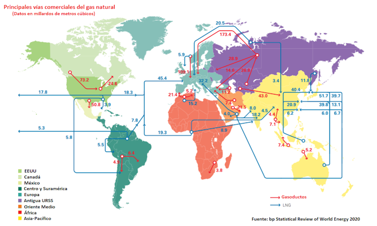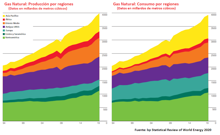 A medida que los gasoductos comenzaron a perfeccionarse, se tendió una tupida red principalmente a escala continental (pero también intercontinental en el caso de continentes separados por distancia relativamente cortas, como el norte de África y el sur de Europa) y el gas natural pasó a ocupar una porción cada vez más relevante en el suministro energético mundial (figura 3).