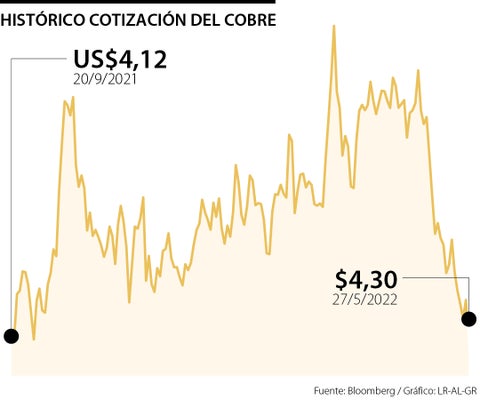 Destaca que las últimas políticas de estímulo económico de China han estabilizado al cobre cerca de US$ 4,2 la libra, lo que debería mantenerse en las próximas semanas y posiblemente hasta el tercer trimestre. La proyección de Cochilco, en tanto, es de US$ 4,40 en promedio para 2022.