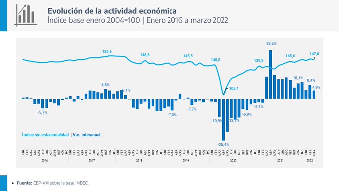De las 15 actividades productivas, 14 crecieron en marzo en términos interanuales y 9 tuvieron subas respecto a igual mes de 2019; se destacaron las de la industria, comercio, electricidad, gas y agua y petróleo y minería. En el acumulado del primer trimestre de 2022 la actividad presentó un alza de 6,1% interanual y de 3,7% frente al mismo período de 2019.