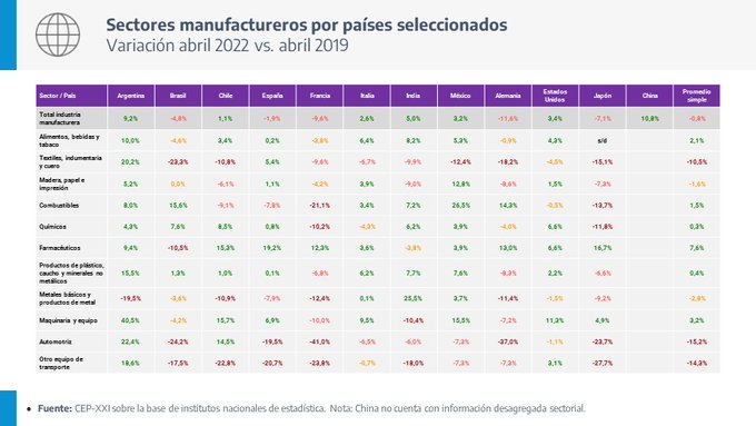 A nivel industrial se sigue viendo un mejor desempeño relativo de Argentina respecto a otros países. En abril-2022, la producción industrial creció 9,2% respecto a abril-2019, cifra superior a la de Brasil, Chile, España, Francia, Italia, India, México, Alemania, EEUU y Japón.