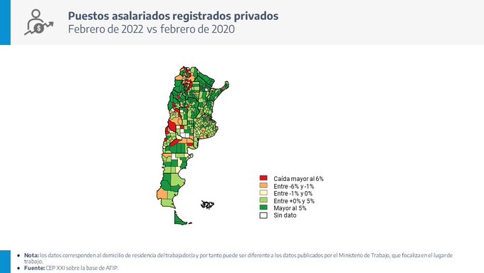 El mapa del empleo está mayormente pintado de verde: el 77% de los departamentos tiene más empleo asalariado formal privado que antes de la pandemia.