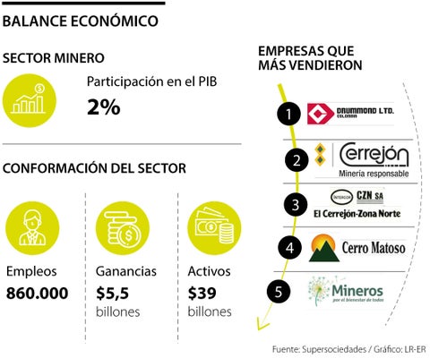 Aunque el aporte de la minería al PIB es de solo 2%, esta industria representa uno de cada US$3 de las exportaciones; 15% de la inversión extranjera directa; 160.000 empleos directos y cerca de 700.000 indirectos. También aporta en promedio $5 billones anuales en impuestos y regalías, y por cada peso que se genera de la minería, se generan $2,4 en otros sectores encadenados.
