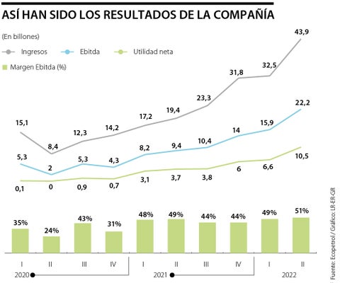La empresa liderada por Felipe Bayón reportó en el semestre que terminó, (enero a junio de 2022) los ingresos por $76,4 billones, mientras que las utilidades crecieron a $17,1 billones. Solo en el periodo abril a junio los ingresos fueron de $43,9 billones y las utilidades $10,5 billones.