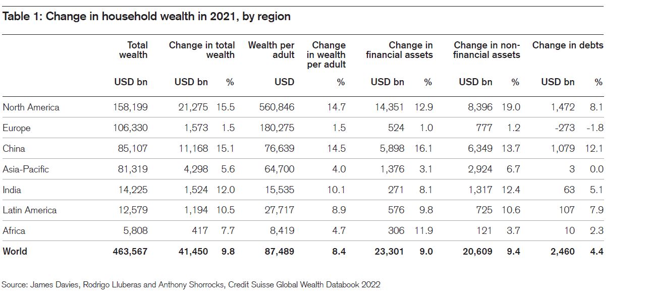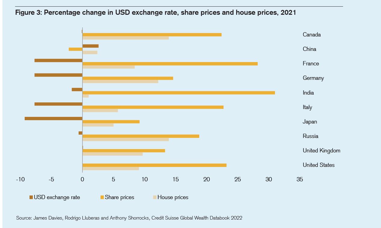 La apreciación del dólar estadounidense deprimió estas tasas en un 2,9%. Dejando de lado los movimientos del tipo de cambio, la riqueza global agregada creció en 12,7% en 2021, que es la tasa anual más rápida jamás registrada.