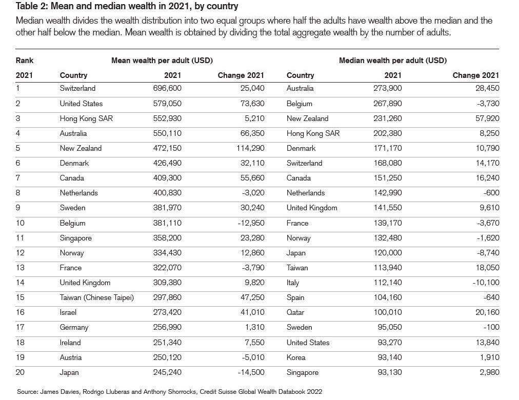 Suiza todavía ocupa el puesto más alto en términos de riqueza por adulto en US$ 696.600, seguida de Estados Unidos; Hong Kong SAR y Australia.