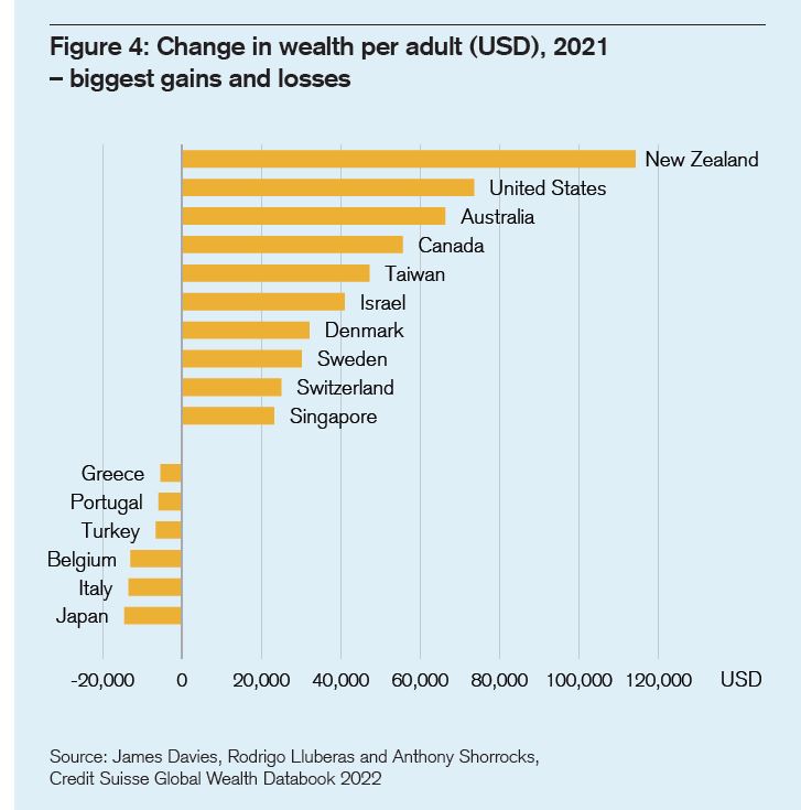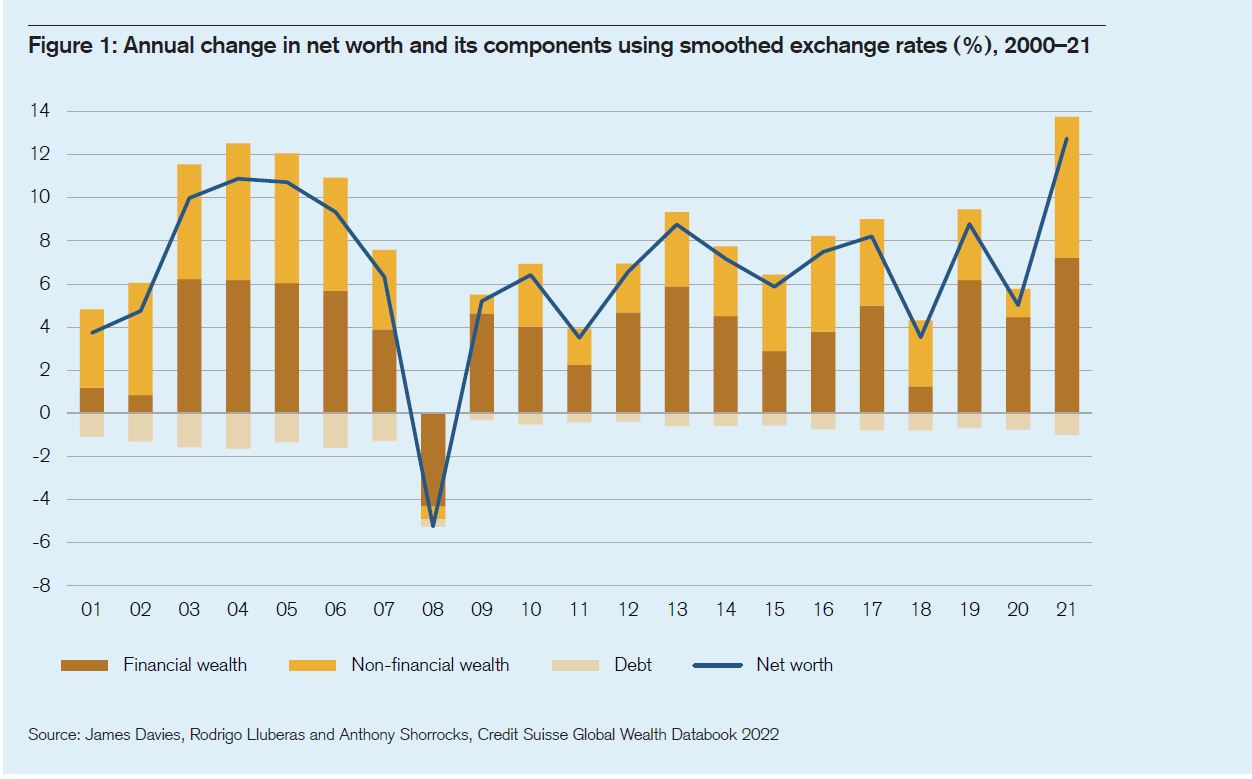 Así, con el intercambio año tras año se descuentam los movimientos de tasa. La riqueza media creció un 11,3% y la riqueza global total un 12,7% en 2021: la tasa más rápida alcanzada este siglo y casi con certeza la tasa más rápida registrada en cualquier momento de la historia.