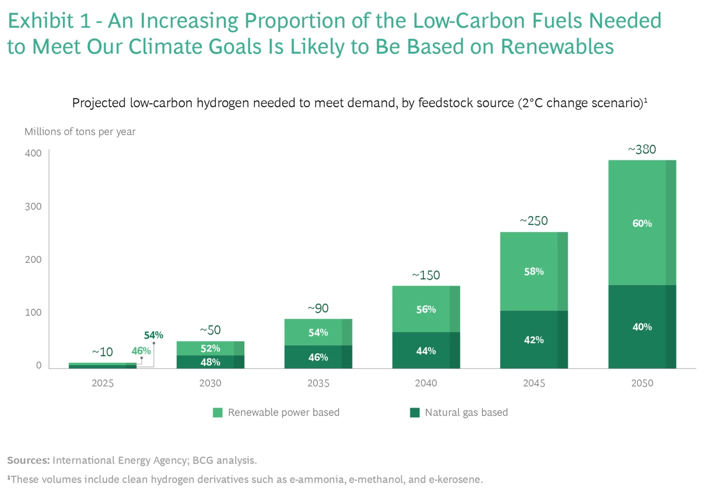 Satisfacer esta necesidad requerirá el desarrollo y la implementación de una combinación de tecnologías de producción de hidrógeno bajo en carbono y combustibles derivados. La producción de hidrógeno bajo en carbono implica el uso de tecnologías de captura de gas natural y carbono o electrólisis impulsada por energía renovable, en gran parte.