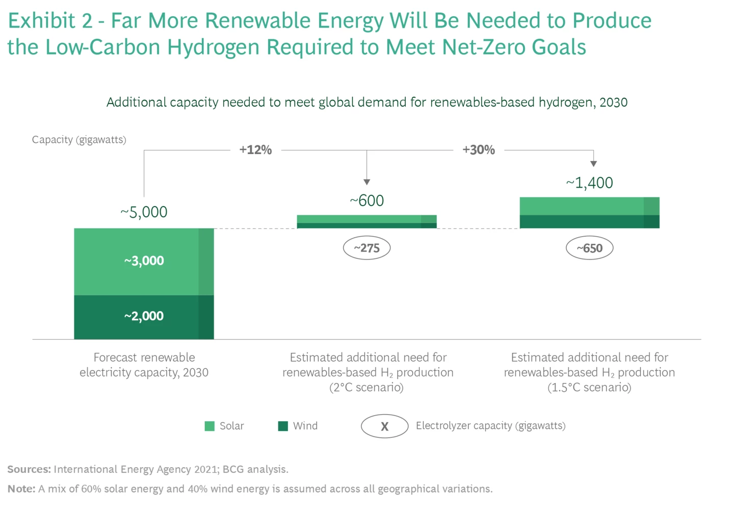 Esta cantidad es adicional a la mayor capacidad renovable necesaria para reemplazar el gas natural que se usa actualmente para generar electricidad en la región, que probablemente tendrá prioridad, ya que los costos de reducción son más bajos para la conversión de gas a energías renovables que para el uso de energías renovables para producir combustibles a base de hidrógeno. para generar energía.