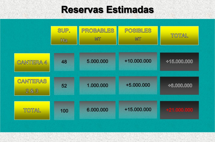 Según su proyección de reservas geológicas, en las 48 hectáreas de la denominada cantera 4 espera conseguir 15 millones de toneladas entre la suma de probables y posibles. En tanto, en las canteras 2 y 3, que cubren una superficie de 52 hectáreas, apunta a reservas de 6 millones de toneladas. Entre toda la zona aspira a 21 millones de toneladas, pero asegura que si en el futuro se hacen más exploraciones puede encontrar mayor cantidad de mineral.