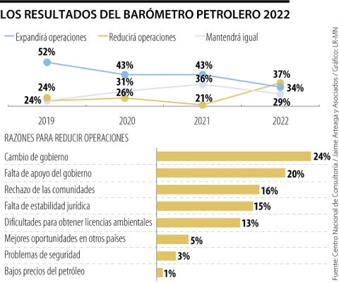 Hoy, 37% de los empresarios petroleros prevé que reducirá sus operaciones en el país en los próximos cinco años. Un porcentaje que aumentó 16 puntos frente a la pasada medición, de 2021, cuando esta perspectiva negativa marcaba 21%.