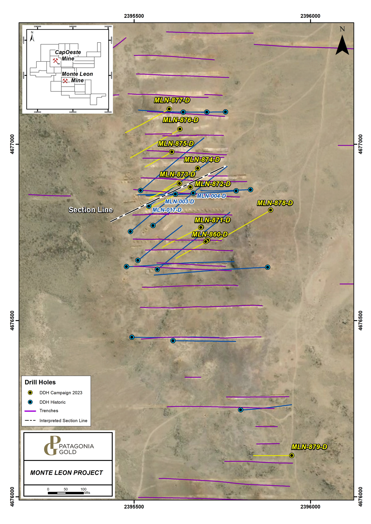 Patagonia Gold perforó 75 pozos de circulación reversa y 21 pozos de extracción en el área general que rodea la perforación reciente de Monte León en 2011 y 2015. La ubicación del trabajo histórico se indica en la siguiente figura.