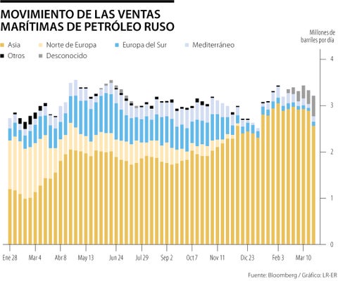 Los flujos de crudo transportado por mar de Rusia se mantienen firmes, lo que significa que la promesa del Kremlin de reducir drásticamente la producción de la nación aún no se refleja en los suministros del mercado internacional.