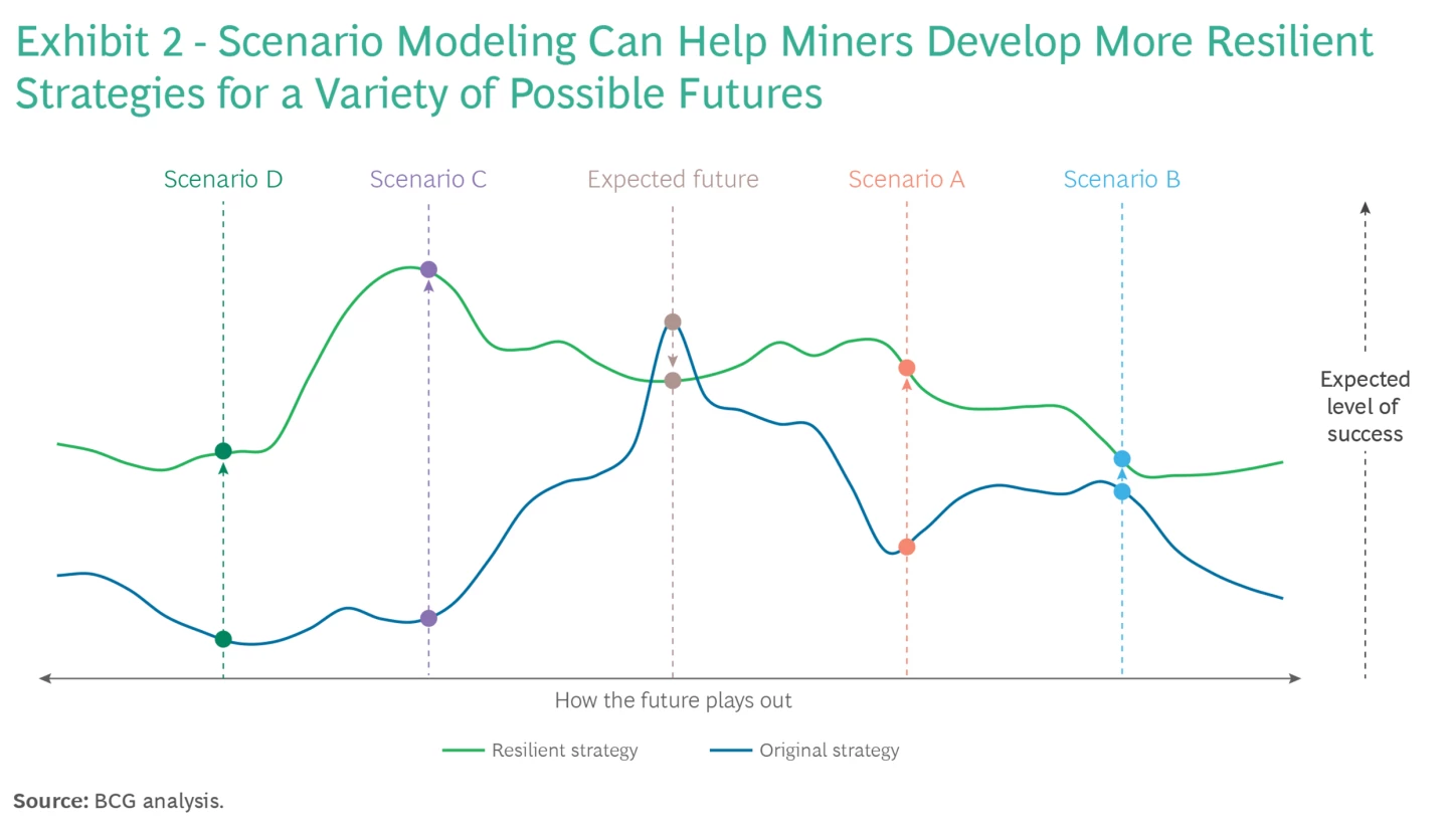 Por último, BCG señala que implementar una efectiva planificación de escenarios en la minería implica un cambio significativo en prácticas y mentalidades. Primero, se debe formar un equipo de estrategia capaz de pensar de manera lateral y desarrollar escenarios alineados con las metas de la empresa.