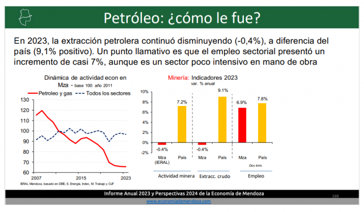 Además, el informe de perspectivas apunta que "en 2023, la extracción petrolera continuó disminuyendo un -0,4% a Mendoza, a diferencia del país, que cerró en positivo por 9,1%". El Ieral sostiene que "un punto llamativo es que el empleo sectorial presentó un incremento de casi 7% en Mendoza, aunque es un sector poco intensivo en mano de obra".