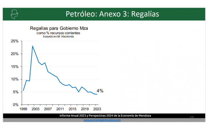 Pese a su declive en los últimos 20 años, los recursos que aportaba la actividad petrolera en Mendoza en concepto de regalías, llegaron a explicar casi el 23% de los recursos provinciales. Actualmente, las regalías significan apenas el 4% de los recursos corrientes con los que cuenta el Ministerio de Hacienda de Mendoza.
