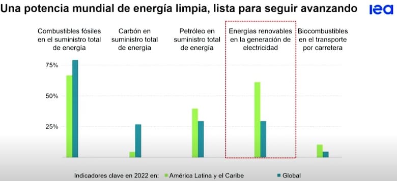 “A pesar del gran liderazgo que tiene América Latina y el Caribe en la generación de energía eléctrica limpia, todavía hay un desafío bastante grande en lo que refiere a la dependencia de combustibles fósiles. Si bien nuestra media de participación en la matriz es menor a la mundial, en América Latina es cerca del 70% versus 80% mundial, todavía es una dependencia muy importante. Porque los combustibles son los que se utilizan también para el transporte, el transporte marítimo, aéreo, terrestre y para la industria”, explicó.