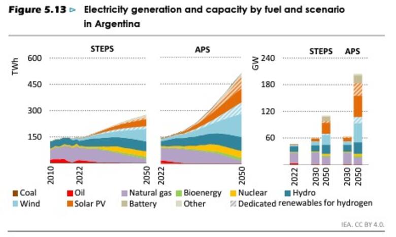 Eso sí, actualmente el gas natural suministra el 50% de la electricidad en la Argentina. Pero, de acuerdo con los expertos, la energía eólica y solar fotovoltaica podría satisfacer la mayor parte del crecimiento de la demanda de cara a 2050, impulsado por el potencial eólico de la Patagonia. En tanto, el petróleo representa casi el 80% del consumo de energía para el transporte.