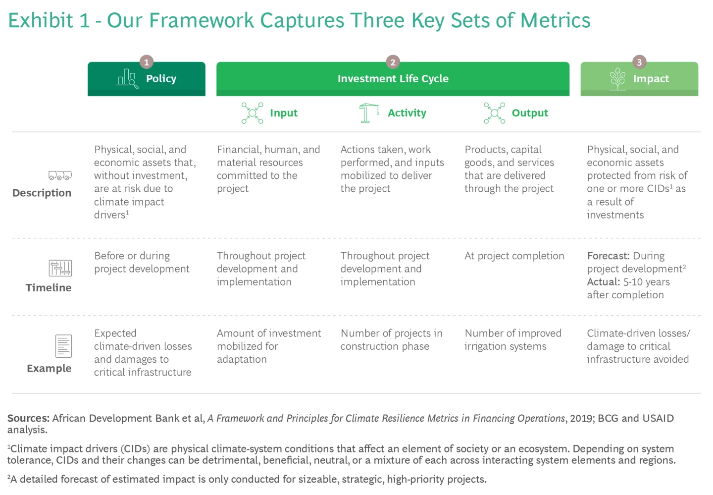 Un aspecto clave del desafío es la falta de consenso sobre cómo medir y hacer un seguimiento del impacto de las inversiones en agricultura y reforestación. A diferencia de la mitigación, para la que existe una métrica unificada (niveles de emisiones reducidos), los proyectos destinados a reducir el impacto futuro del cambio climático a causa de peligros como el aumento del nivel del mar o el calor extremo carecen de parámetros de referencia acordados para su éxito. Además, algunas iniciativas de agricultura y reforestación, como la restauración de manglares, también pueden contribuir a la mitigación.