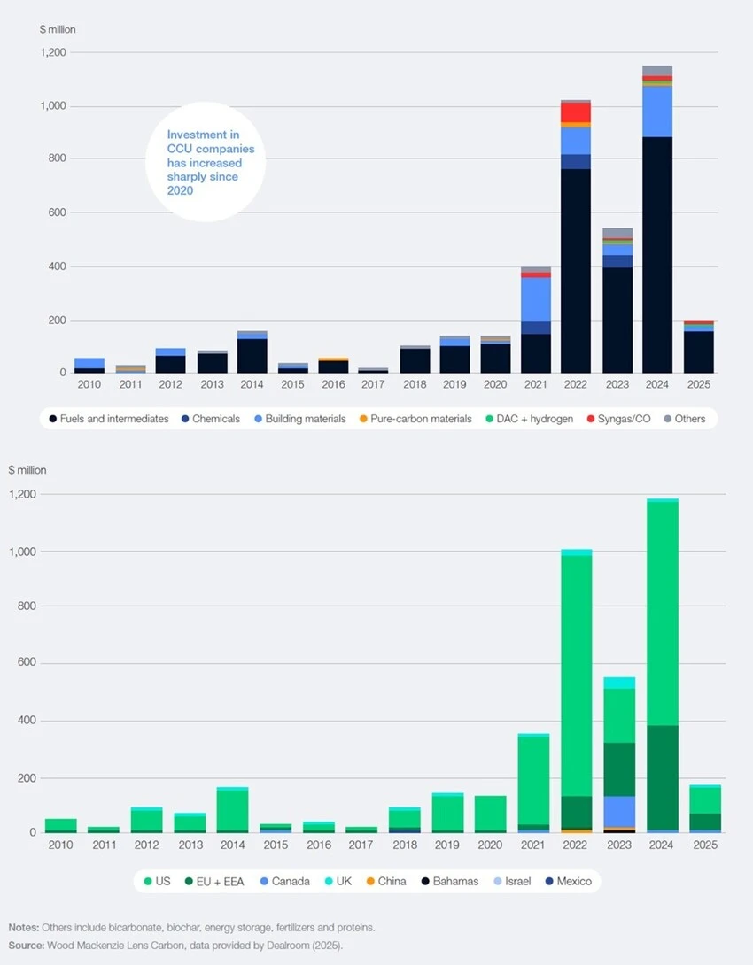 La CCU convierte el CO₂ en productos valiosos como combustibles, productos químicos y materiales de construcción, lo que amplía el uso del carbono en la economía y reduce la dependencia de los recursos fósiles. Si bien existen usos probados, como la producción de urea para la agricultura, la mayoría de las vías emergentes aún son comercialmente inmaduras, limitadas por políticas fragmentadas, financiación obsoleta y dificultades de integración. Actualmente, la actividad se concentra en regiones con financiación o regulación favorables (Europa Occidental, los Estados del Golfo, China, Australia, EE. UU. y Canadá), donde avanzan proyectos pioneros sin urea.