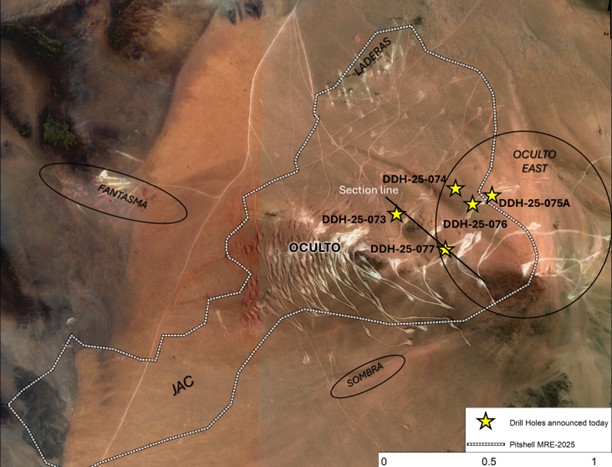 Además de la exitosa expansión de los óxidos superficiales, la compañía está avanzando en la exploración de un potencial complejo de pórfidos, ubicado a unos 4 kilómetros al noreste de Oculto.