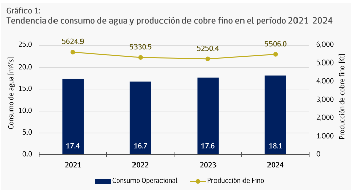 La tasa de recirculación, sin embargo, cayó de 74,2% a 71,0%. Según Cochilco, esto no implica una reducción real en eficiencia, sino un efecto estadístico derivado del incremento en los volúmenes reportados bajo la nueva metodología.