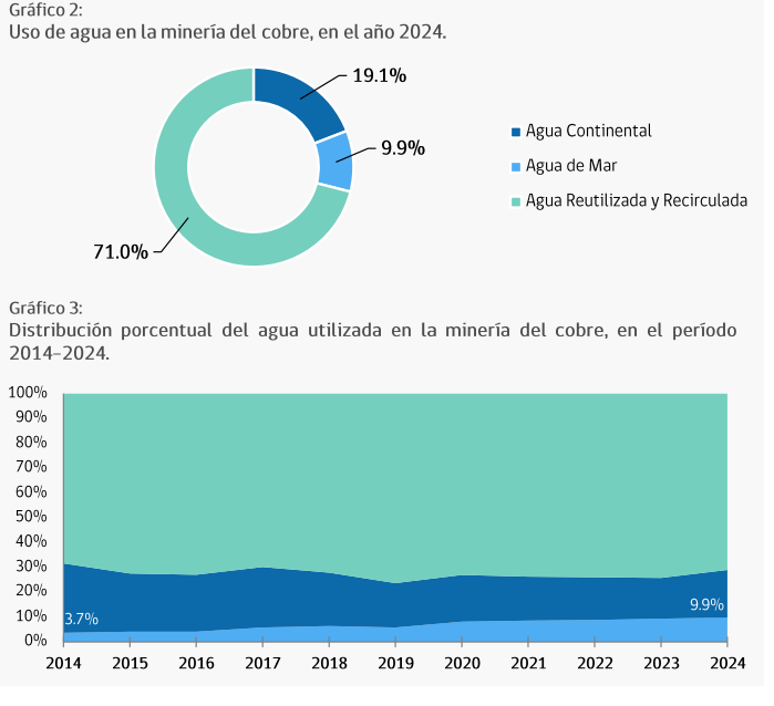 El estudio muestra que, pese al aumento en la producción de cobre fino y en el consumo total de agua, la minería continúa avanzando hacia una matriz hídrica más sostenible, con mayor participación de agua de mar, más recuperación interna y una reducción en la intensidad del consumo.