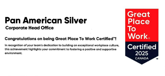 Pan American Silver anunció con orgullo que su Oficina Corporativa ha sido oficialmente certificada como un Gran Lugar para Trabajar (Great Place to Work). Este prestigioso reconocimiento subraya el éxito de los esfuerzos de la compañía por fomentar una cultura laboral positiva basada en la confianza y el respeto mutuo.